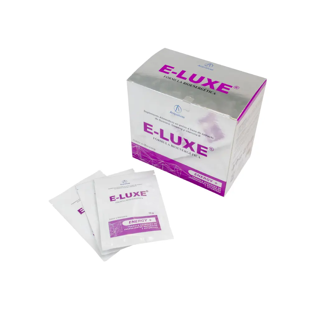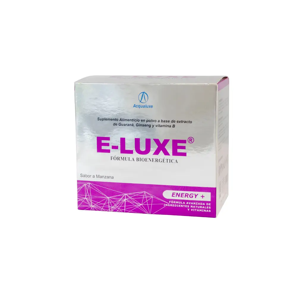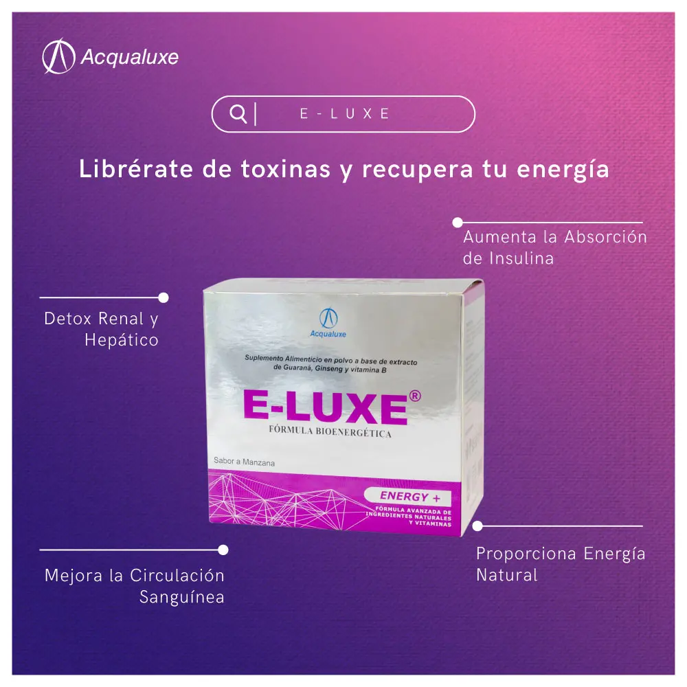 Revoluciona tu bienestar con E-LUXE, un alimento funcional 100% orgánico con propiedades nutracéuticas diseñado para depurar profundamente tu organismo y optimizar tu salud. Su poderosa fórmula detox bioenergética trabaja desde el interior para recuperar y mantener un óptimo estado de salud.